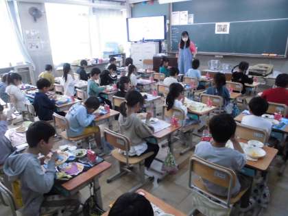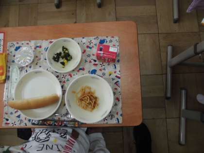 14日(木)は1年生にとってはじめての給食でした。献立はスパゲッティのミートソース煮,ほうれん草のソテー・リンゴゼリー・牛乳・小型コッペパンでした。給食調理員さんもこの日を心待ちにして,春休みから準備を進めていました。はじめは,少しの量からスタートし,おかわりをする人は,おかわりをしていました。なんと一日目から完食でした。