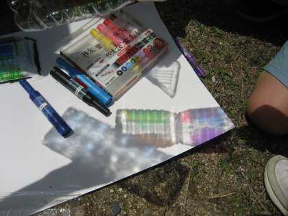 持ってきた材料に,カラーペンで色を塗り,地面に映しました。