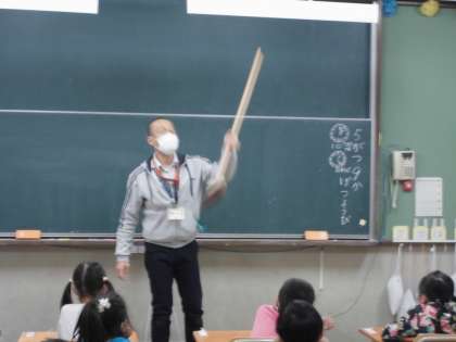 ホウキが泣く使い方を見本で見せてくれたり,上手なゴミの集め方を教えてくれたりしたので,みんな真剣にお話を聞いていました。
