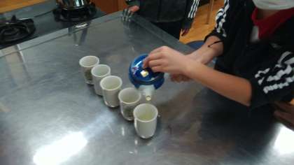 ガスコンロの使い方を知り,お湯を沸かしました。茶葉やお湯の量をはかり,お茶をいれます。苦味のあるお茶でしたが,自分たちでいれたお茶はとてもおいしかったようです。次は調理実習です。がんばります!