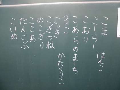 ひらがな「こ」の勉強です。一画目と二画目を少し右下がりに書くことも勉強しましたが,学校では,「こ」のつくことばという風に,言葉集めもしています。実はこれも大切な学習で,子ども達の言語の力をつける一つの手段です。お家でも楽しみながらゲーム感覚で今までならったひらがなのつく言葉を集めてみてはいかがでしょうか。