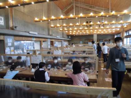 市内よりも少し心地よい風が吹く,花背山の家1日目の夕食の様子です。今日の活動でおなかがすいたのか,たくさん食べていました。みんな元気に夕食を食べています。