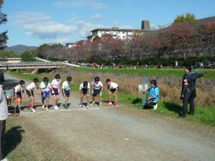 晩秋の美しい青空の下,西京西支部の子どもたちが,大文字駅伝出場を目指してたすきをつなぎました。10時30分にスタート。桂坂・福西・大枝で混戦模様のレース展開から徐々に桂坂がリードを広げます。なんとか食らいついていた大枝ですが最終,2位で予選を通過し,出場権を手にしました。