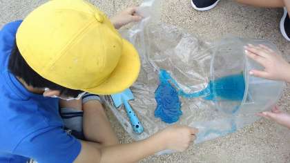 地面で高低差がある場所を探したり作ったりして色水を流して確かめると,高いところから低いところへ流れていくことがわかりました。