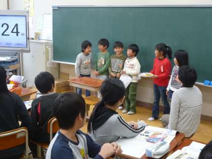 1年生はお芋掘りで収穫したサツマイモを使って,お菓子作りに挑戦。保護者の方にもお手伝いいただいておいしいおやつが完成。6年生にもおすそ分けが。おいしくできたおやつを前に,1年生は自慢げな様子です。