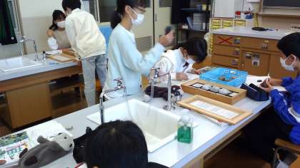 れき,砂,どろなどの地層が長い年月をかけて岩石になることを学び,さまざまな岩石を実際に観察しました。色や重さの違い,さわりごこちなどいろいろな視点で観察をすることができました。