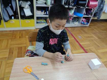算数科では、「はこの形」を学習しています。厚紙を使ってはこを作ったり、ひごを使ってはこの形を作ったりしています。