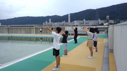 今日はくもりで太陽は見えませんでしたが、屋上に上って太陽の角度を調べる方法を学びました。