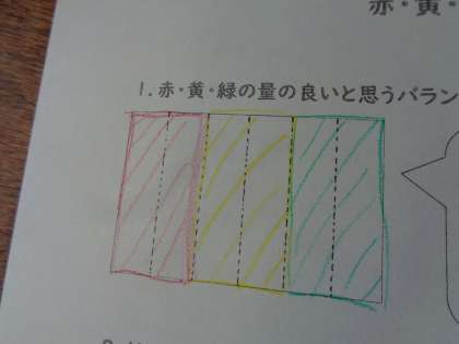 同じ量ずつ食べるのがよいと予想した児童や、黄を多く、緑を多くした方がよい児童など、色々な考えがあり、理由もそれぞれでした。