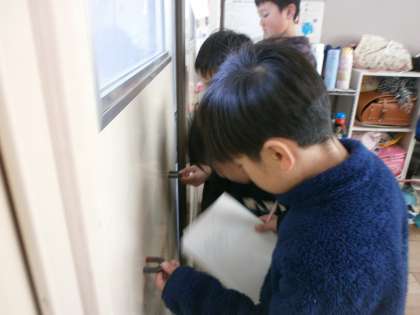 子どもたちは、身近なものに磁石を近づけて、「これはつくな」「これはつかないよ」と楽しそうに調べていました。
