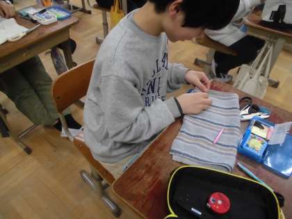 お世話になった人たちへぞうきんを渡すため、ぞうきん作りを始めました。