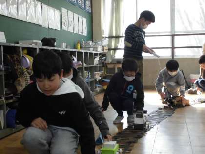 それぞれの作った作品の良さ・ドリームはどんなところにあるのかということを交流し、最後に全員で作った線路の上を走らせました。とても明るい児童の表情を見ることができました。