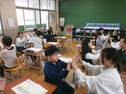 アの部分では足ぶみをして、イの部分では歌のリズムで2人で手合せをして楽しみました。