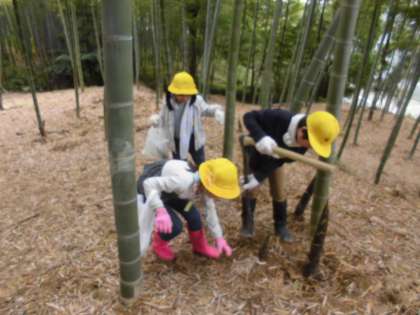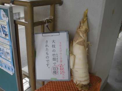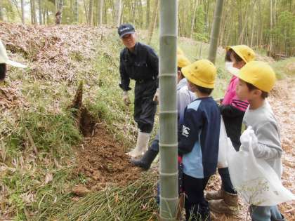 3年生は総合の学習で、大枝校区にある田原さん、内藤さんの竹畑にたけのこ学習に出かけました。