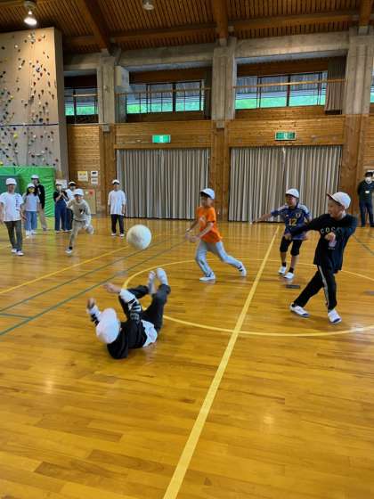 外はあいにくの雨で活動が制限されたため、プレイホールでドッジボールをしました。