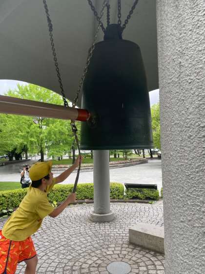 資料館での見学も終わり、雨が上がったので、平和への願いを込めて鐘を突きました。