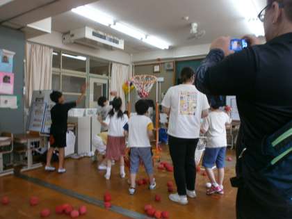 自己紹介をしたり、一緒に遊んだりしました。玉入れの場面では、ボールをそっと渡している姿や、ボールがかごに入りやすくするようにかごの向きを変えたりしている姿が見られました。