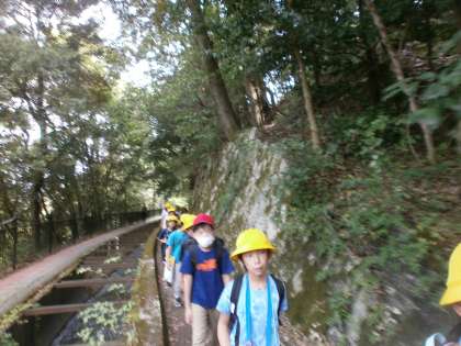 南禅寺の水路閣を見て、インクラインをみんなで歩きました。水力発電に使われた太い銅管やドラム工場の中にある大きなドラムも実際に見て、感動していました。