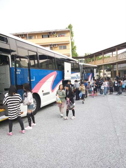 青空の下、6年生が元気に修学旅行に出発しました。目的地は淡路島です。