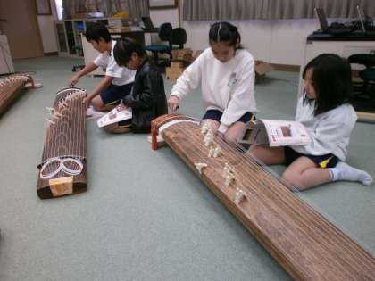 初めて目の前で見るお箏に「大きいな。」「木でできているんだな。」と驚いていました。