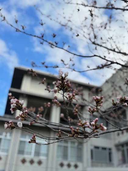 校内のあちらこちらでは、桜の花が少しずつ咲き始めています。