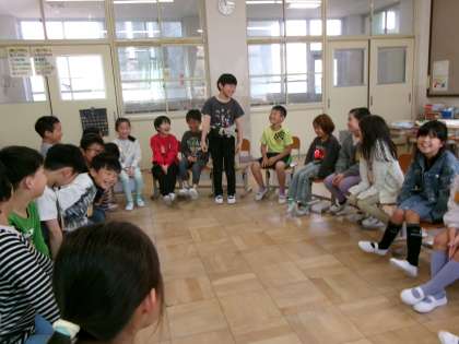 国語科で「よく聞いて、じこしょうかい」の学習をしました。隣の友だちが言ったことを繰り返しながら、自分の自己紹介をしました。