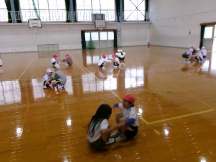 体育科では「体ほぐしのうんどう」の学習をしています。ペアやグループで協力しながら立ち上がったり、フラフープをくぐったりする活動をしました。