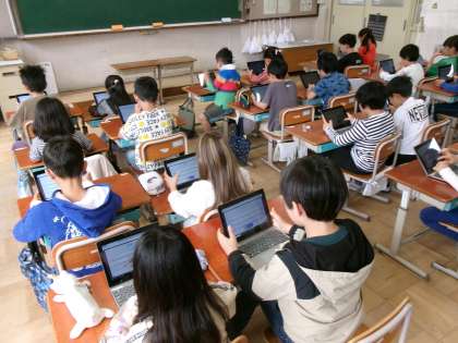 算数科では「九九の表とかけ算」の学習を進めています。今日は単元のふり返りで、タブレット端末を使ってまとめ問題に取り組みました。