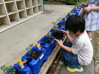 今日は、ミニトマトの苗を植えました。植えたときの気持ちを動画で撮りました。「たくさん実ってね。」「早く大きくなってね。」「ぼくのお弁当にも入れてね。」「いっぱい育ったら、家族のみんなで食べようね。」かわいい声かけがたくさん聞こえてきました。次の観察も楽しみです♪