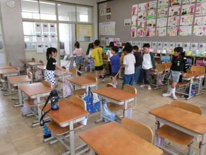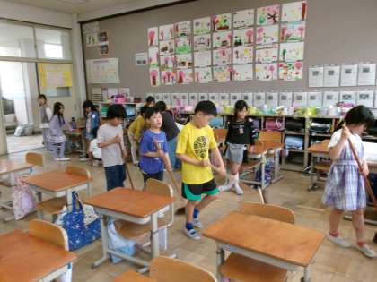 今日もみんなで協力して、教室や廊下をきれいに掃除しました。ほうき係は、列になって掃きます。掃き終わると、「1列目お願いします。」と言い、机運び係が運びます。みんなで声をかけ合ってがんばっています。