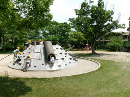 境谷公園に着くと、あみあみの遊具や大きな滑り台を見て「早く遊びたい!」と口々に言っていました。