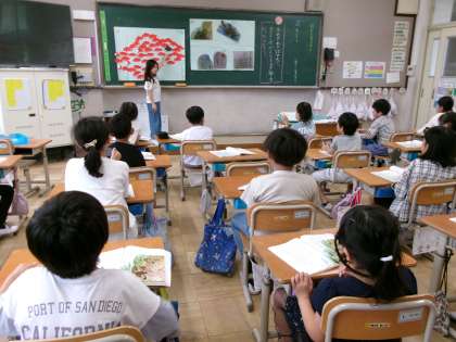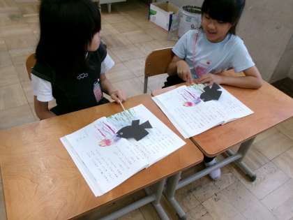 国語は「スイミー」の学習が進んでいます。それぞれの場面で、「スイミー」はどんな様子だったか話し合いました。一人一人「スイミー」のペープサートを持って、気持ちを考えています。