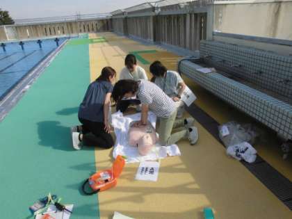 今回は、水泳学習中に1人の児童がプールで溺れ、意識がなくなったという想定で行いました。