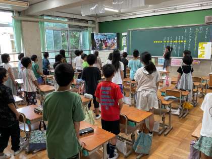 一時間目が始まる前の朝の会の時間帯に、4年生の教室からは.毎朝子どもたちの歌声が聴こえてきます。朝の会で、朝の歌をみんなで歌っています。朝から歌を歌うことで子どもたちの一日が気持ちよく始まります。「今日は何の曲にしようかな」と日直当番が選曲して、今朝の一曲が決まります。教科書に載っている曲だけでなく、流行りのポップスも歌います。子どもたちは、歌うことが大好きです。
