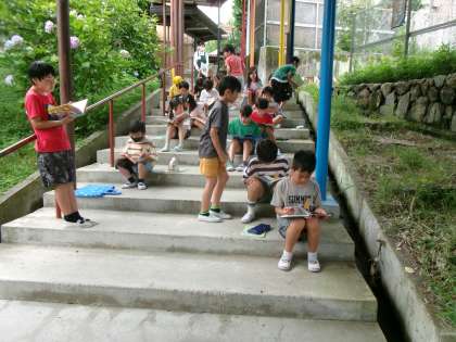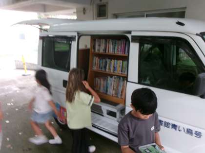 今日は青い鳥号にある本を読みに行きました。いつも学校では読めない本に、子どもたちも嬉しそうな様子でした。