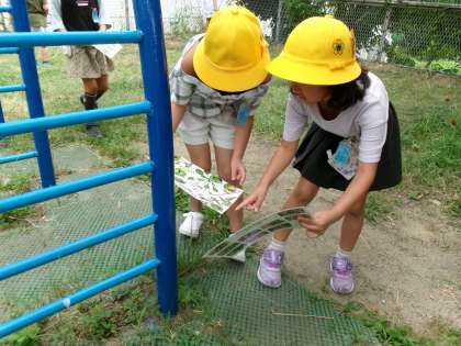 子ども達は、休み時間になると虫探しに夢中です!夏に虫を探しに行こう!ということで、中庭や体育館の裏にある広場に行きました。バッタやカエル、トンボにコオロギなどたくさんの虫を見つけることができました。「蝉の抜け殻があった!」ウキウキした子ども達の声。蝉の鳴き声がきこえるものもうすぐですね!