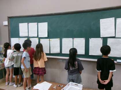 国語科では「仕事のくふう見つけたよ」の学習を進めています。書き方のポイントを意識しながら、調べたことを報告する文章を書きました。書いた後は、友だちが書いた文章を見比べて、一番よく書けているのはどれかな、と考えました。