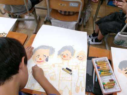 9月の敬老の日に向けて敬老ポスターに取り組みました。髪の毛の色や顔の表情を工夫して、描きました。最後にメッセージを入れて完成させました。