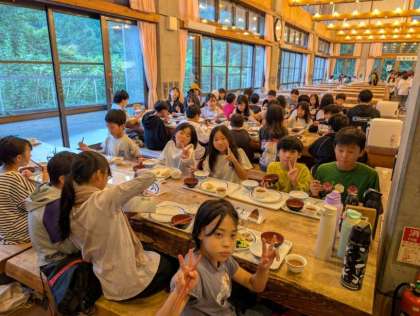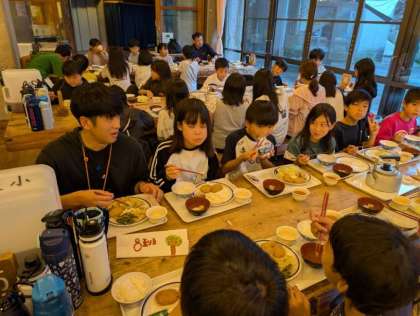 活動中には疲れも見え始めた子どもたちですが、食事の時間になると元気が復活し、まさにエネルギーを充電しているようです。