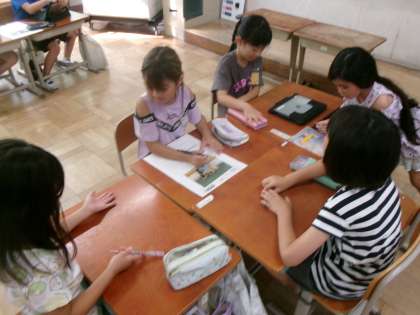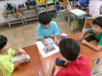 係活動では係ごとのポスター作りを進めています。みんなが描きたいものを、分担しながら1枚のポスターに上手に描いていました。
