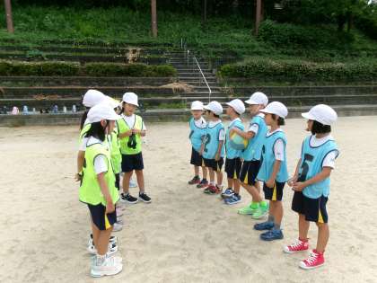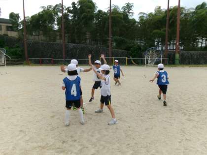 パスゲームの学習をしています。「パスパス!」と声を出したり、右に左に周りを見ながら動いたりしています。パスがもらえるように考えているのがうかがえました。