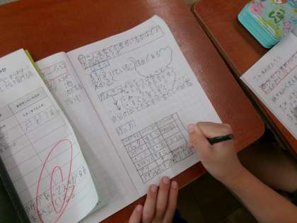 今日は学習のまとめで、見つけたこん虫やその場所について表をかいたり、なぜその場所にいたのか考察したりしました。