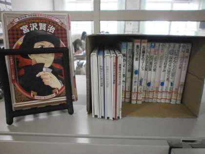 6年生の教室前には、宮沢賢治の「やまなし」の学習に関連して、宮沢賢治の本が数多く並べられています。