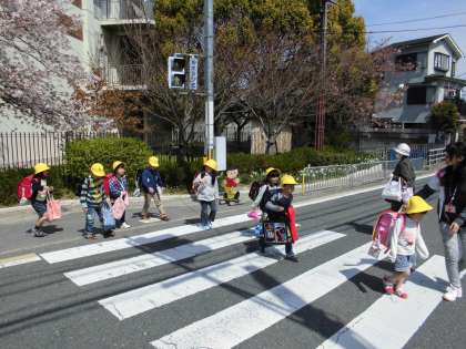 入学式から1週間が過ぎました。朝は高学年のリーダーさんのすぐ後ろを集団登校で,帰りは同方向へ帰るグループごとに集団下校をしています。昨年度からドライバーさんに気付いてもらい,減速してもらえるように,黄色い帽子をかぶっての登下校です。「1人でも帰れる〜」という声も聞こえてきますが,通学路はもうおぼえられたかな?