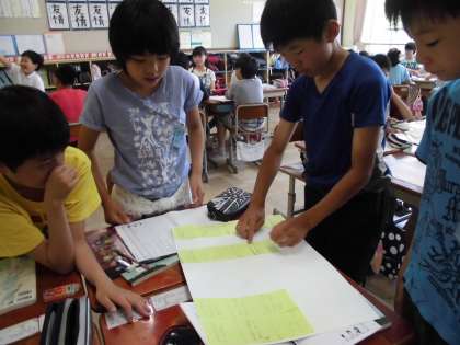 主張を述べるときに大切にすることは,より多くの人に納得してもらうために理由や根拠を示すこと。そこで取り組んだのが「話し合いの見える化」です。思いついたことを付箋紙に書き出し,整理してグループ全体としての意見をまとめました。