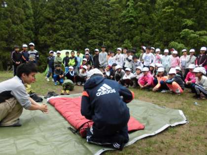 百井キャンプ場に着いてすぐテントをはり,シュラフを運び自分たちの寝るところをつくりました。初めてのテントはりに悪戦苦闘しながらもみんなで協力して自分たちの力でテントをはることができました。