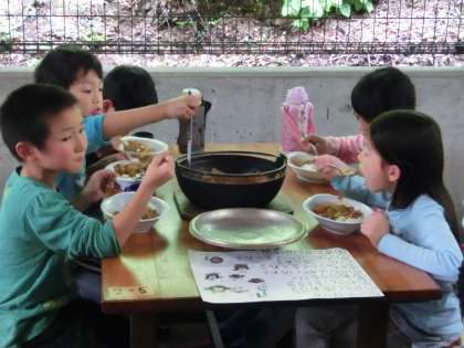 時々小雨が降る天候ですが,プログラムは予定通り進んでいます。かまどでの野外炊事は,どのグループもおいしいカレーが完成しました。自分たちで火をおこし,ガスや電気ではない薪の炎で調理して作ったカレーは格別だったようです。