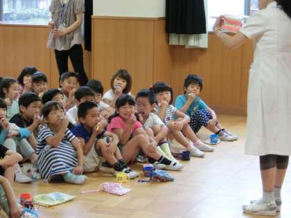 子どもたちは正しい歯の磨き方を教えてもらい,持参した歯ブラシで実際に練習しました。いつまでも自分の歯でいられるようにするために,毎日の歯磨きはとても大切です。ただ,歯磨きをすればよいというわけではありません。効果的な磨き方でしっかり歯のケアをしましょう。