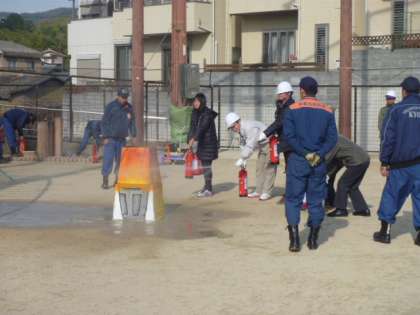 消火体験コーナーでは,消火器を使って,炎(的)に水をかける訓練が行われました。