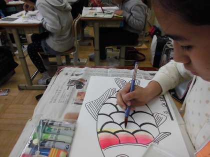 図工の学習で色彩を考えて魚の色をぬる学習をしました。